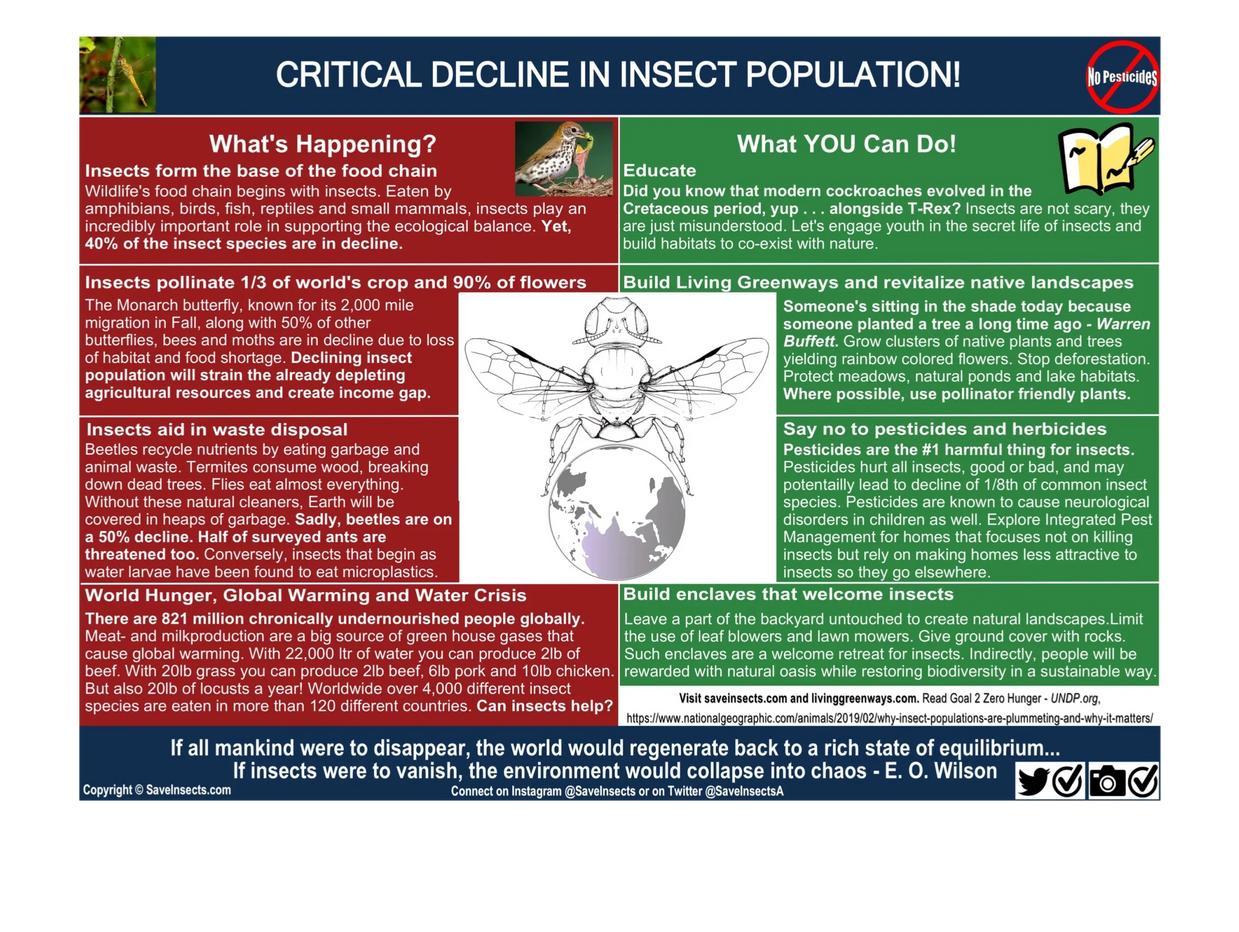 Change begins at home. Let's create awareness about these beautiful creations of nature and change people's perspective. The goal is to show case importance of insects in the food cycle, highlight at-risk population from loss of habitat and study the effects from global warming on local insect population.